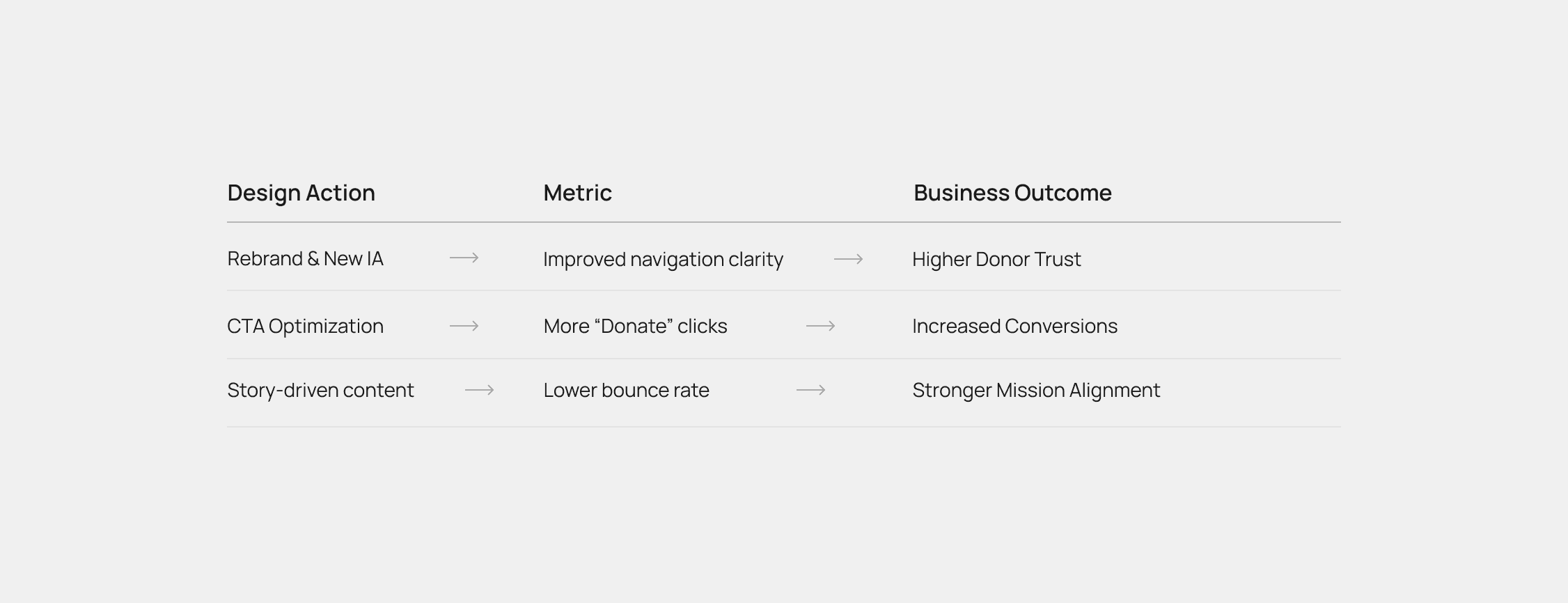 Streamlined navigation & CTAs → Improved conversion funnel → Higher donation rates and newsletter sign-ups.