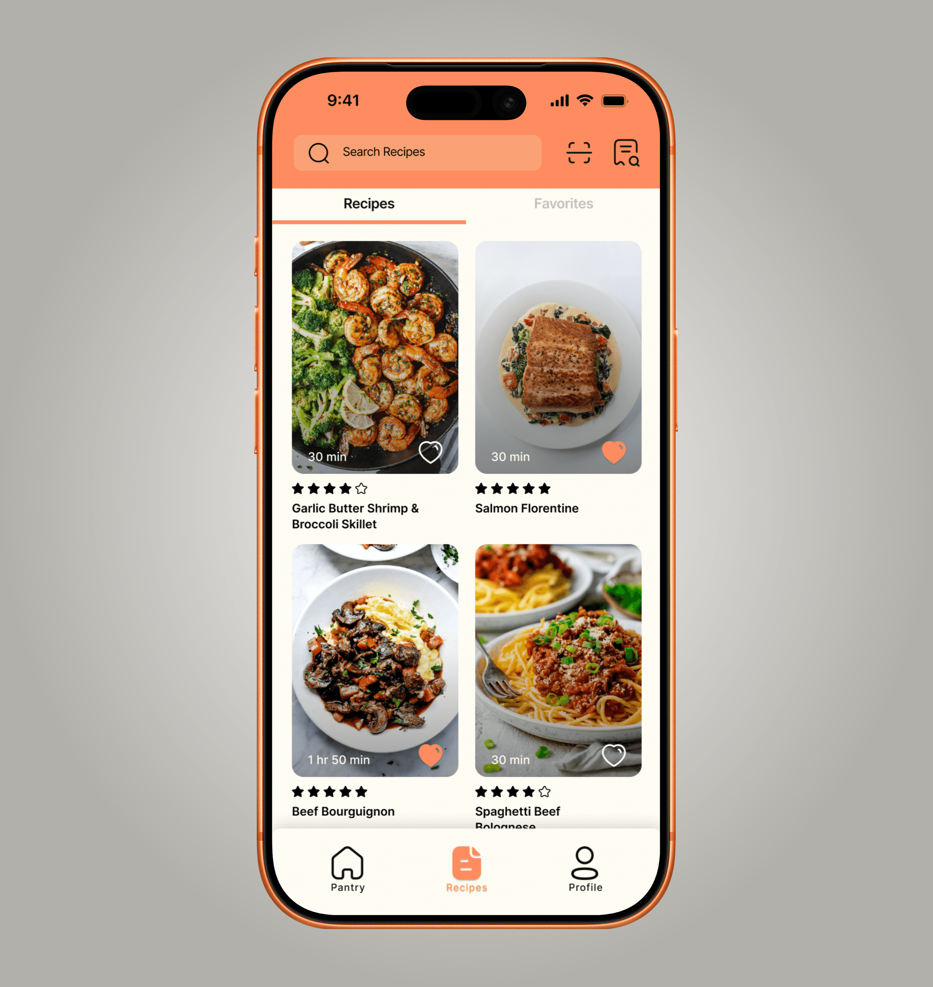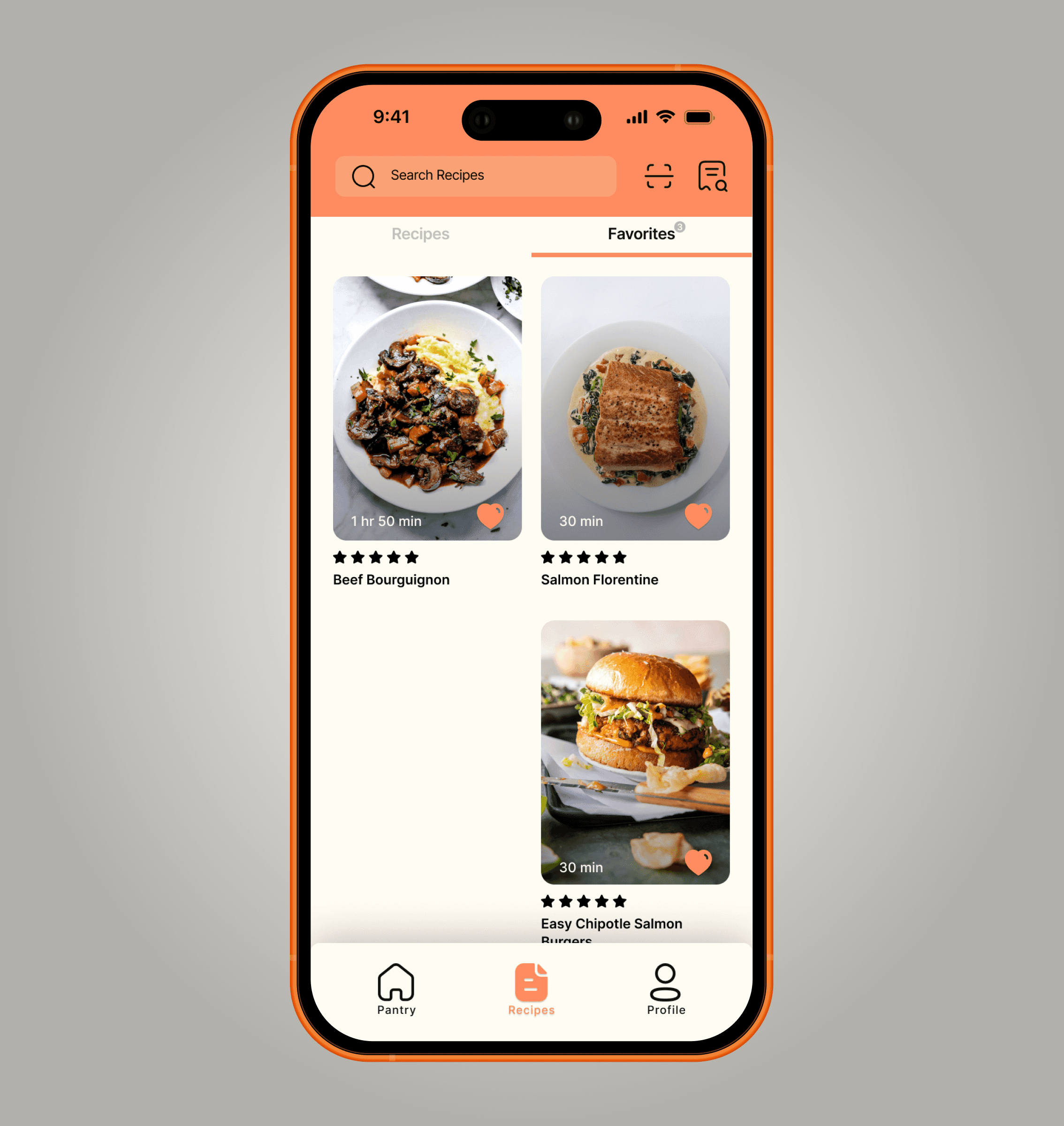 The recipe generator suggests recipes based on the ingredients and food items you have available in your smart pantry, and includes a favorites tab for easy access.